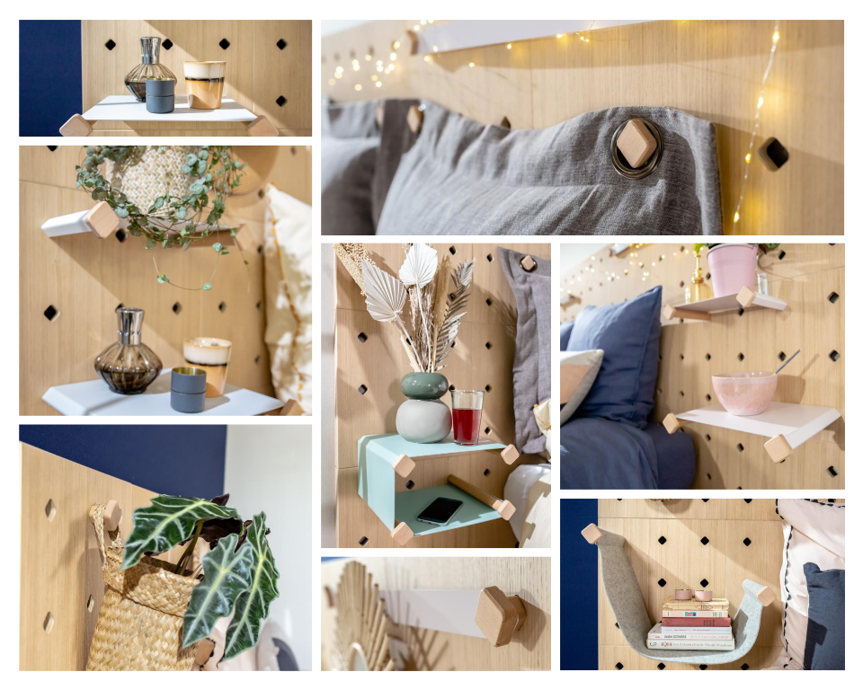 Noctys, c’est une belle tête de lit accrochée au mur, associée à des accessoires modulables à sélectionner. Ensemble, ils transforment le mur derrière votre lit.